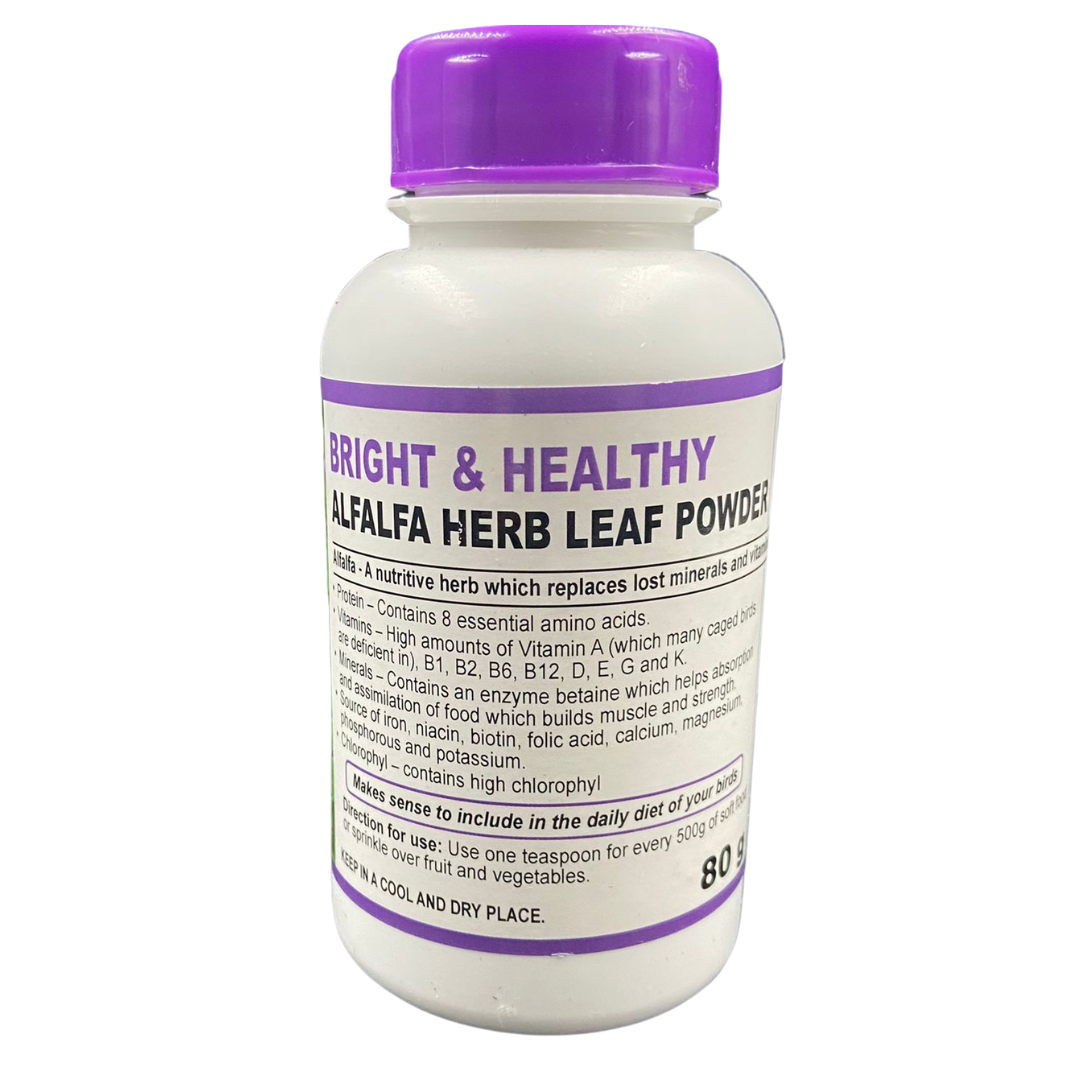 Alfalfa is a legume (member of the pea and bean family). Alfalfa is a natural protein that is easily digested by the body. Natural protein supported by the 8 amino acids. Alfalfa contain a high concentrations of Vit A (many birds are deficient in Vit A), B1, B2, B6, B12, C & D (Vitamin D is essential especially for birds that spend much time indoors), E, K and also Niacin, Biotin, Pantothenic and Folic Acid. Also rich in Minerals – Boron, Calcium, Chlorine, Cobalt, Copper, Iron, Magnesium, Manganese, Molybdenum, Phosphorous, Potassium, Sulphur and also some Trace Minerals. (trace minerals are important for normal growth, and all kinds of biological functions.