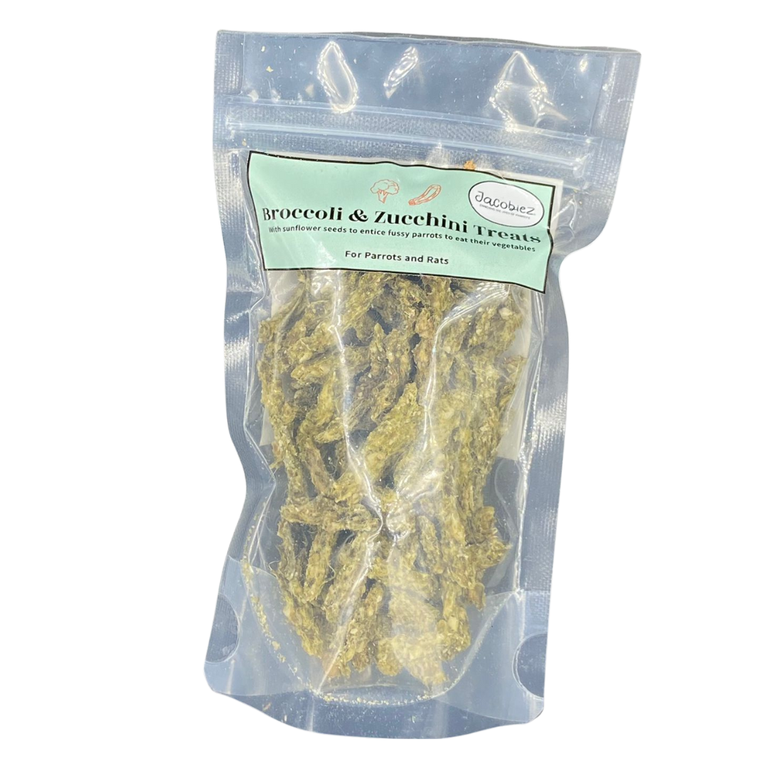 A delicious dehydrated Broccoli and Zucchini treat mixed with rolled oats, millet and flaxseed. This treat is good for parrots, rats and rabbits. Flaxseed contains omega 3 fatty acids that help maintain skin and fur or feather health.