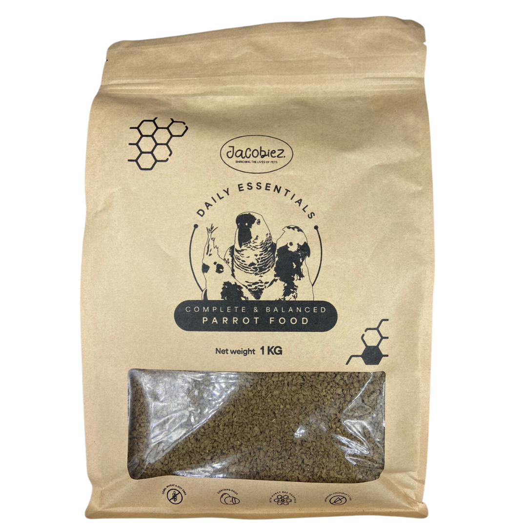 Jacobiez Daily Essentials is a complete & balanced diet and can be fed fresh daily as the only source of food. Jacobiez complete parrot food may also be used to supplement an all-vegetable and fruit diet.