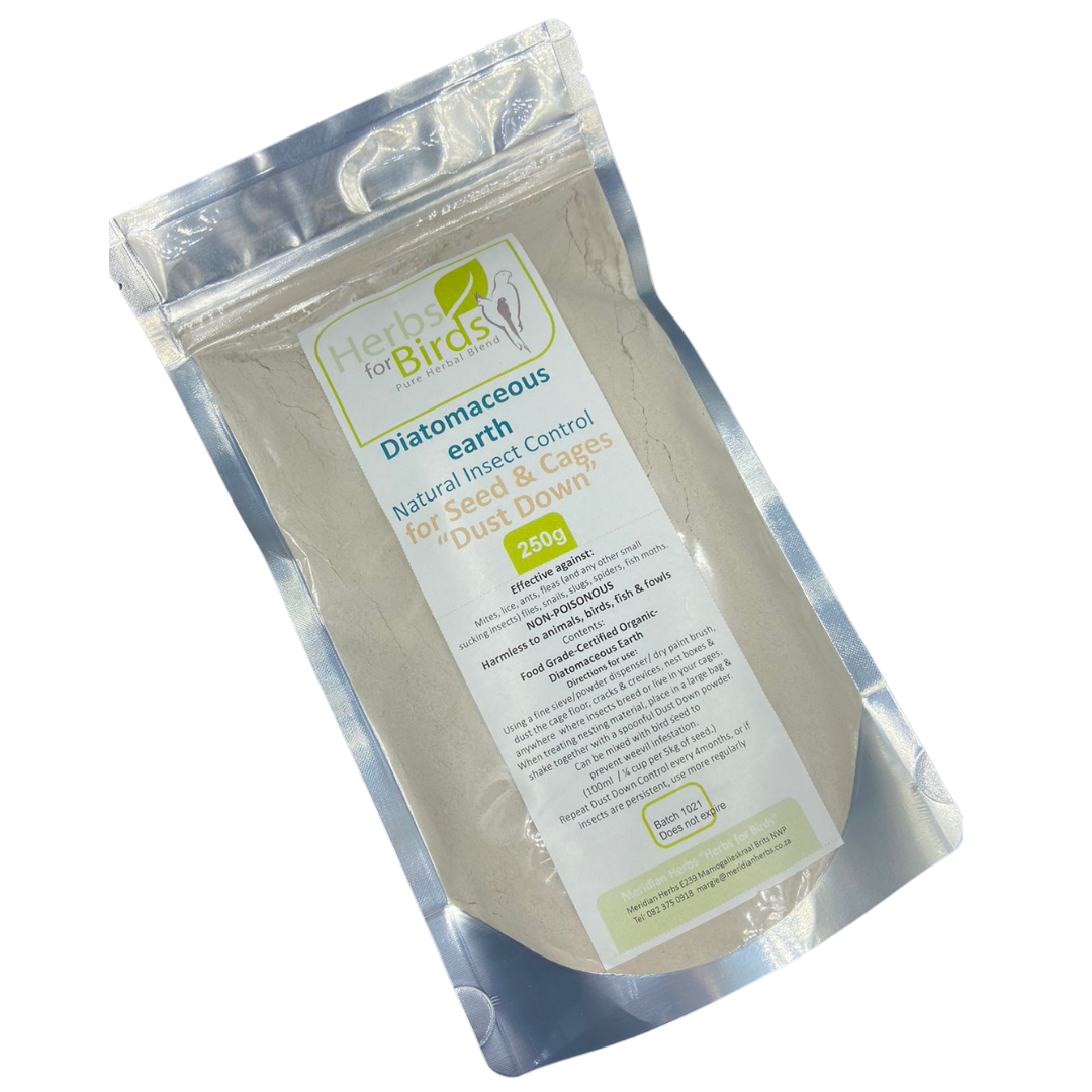 ‘Herbs for Birds Dust Down’ is a high quality, Certified Organic, Food Grade, diatomaceous earth (DE). It is a totally natural product & absolutely NON-poisonous.