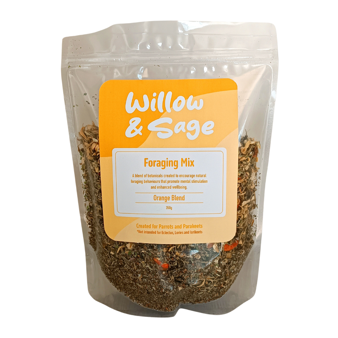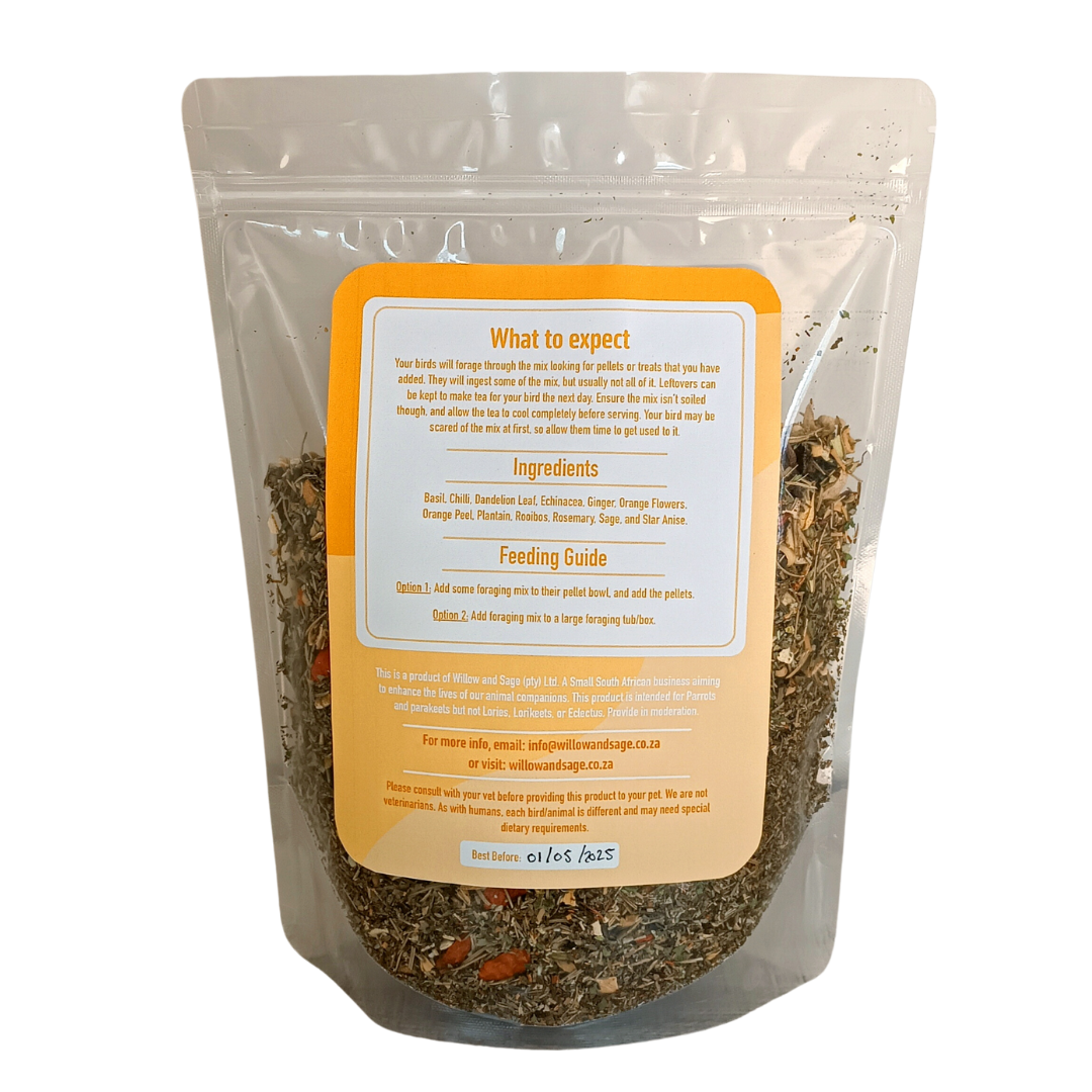 This foraging mix contains a blend of 12 tasty and nutritious, food-grade botanicals. Simply add 1cm (or more) of the mix into a foraging box and add your bird's pellets and treats. Alternatively, you can add some of the mix to their pellet bowl and add their pellets/dry mix to the mix. Your birds will be encouraged to engage in natural and mentally stimulating foraging behaviours. This foraging mix is both nutritious and a great way to keep your birds busy. Any unsoiled leftovers can be made into a tea. Simply let the tea brew in hot water and allow it to cool fully before serving.