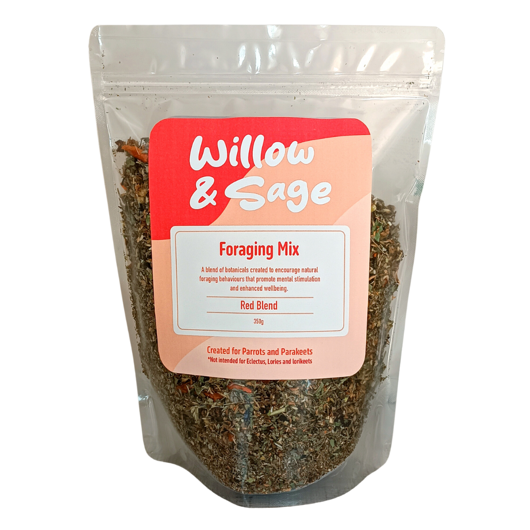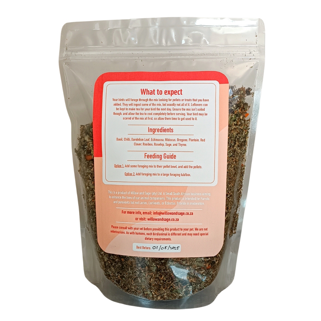This foraging mix contains a blend of 12 tasty and nutritious, food-grade botanicals. Simply add 1cm (or more) of the mix into a foraging box and add your birds pellets and treats. Alternatively, you can add some of the mix to their pellet bowl and add their pellets/dry mix to the mix. Your birds will be encouraged to engage in natural and mentally stimulating foraging behaviours. This foraging mix is both nutritious and a great way to keep your birds busy. Any unsoiled leftovers can be made into a tea. Simply let the tea brew in hot water and allow it to cool fully before serving.