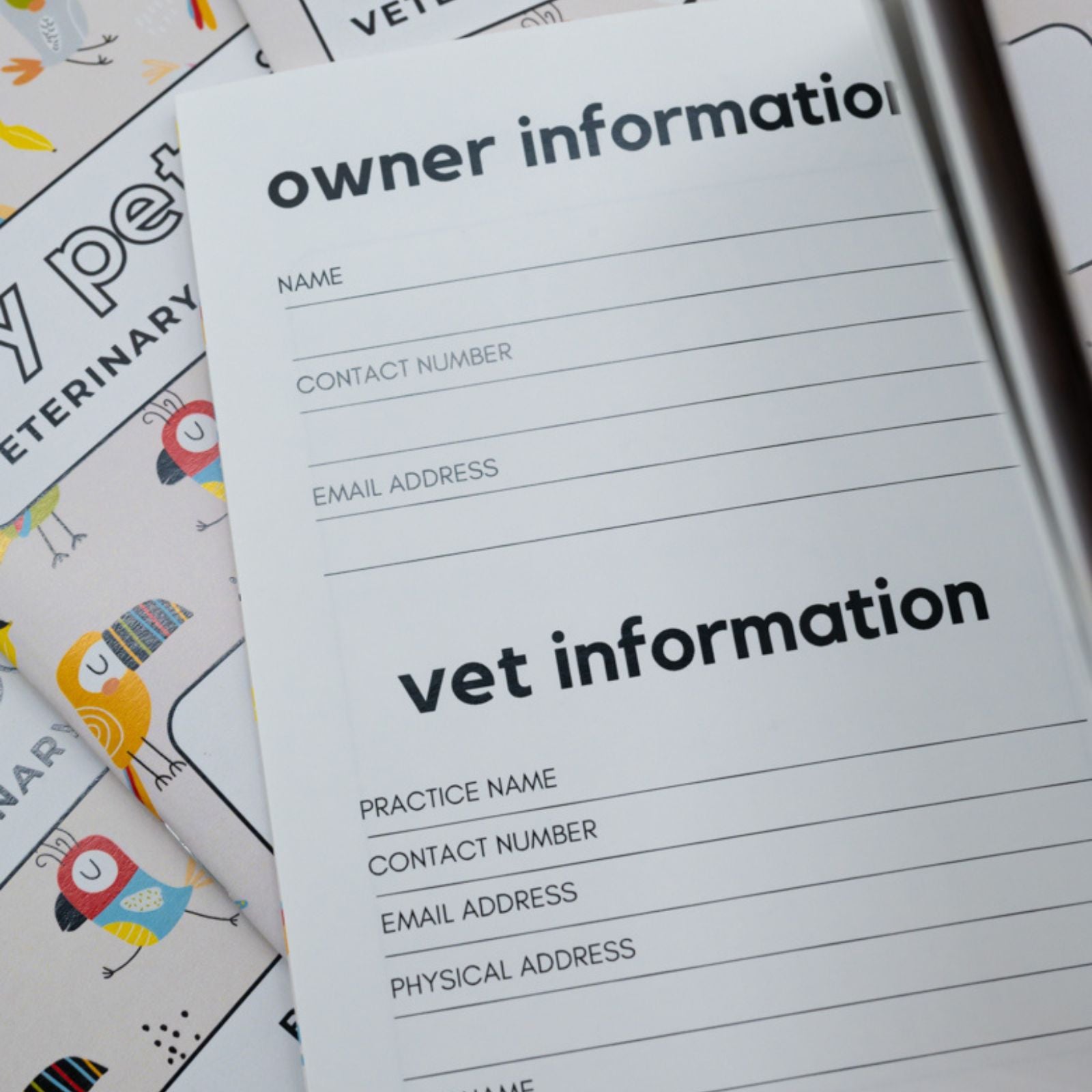 These hardy A6 (168mm x 105mm) books contains space for owner information, pet information, as well as space to log various veterinary and associated records. (eg. weight chart, surgery log, mites treatment records, vet appointment details etc)
