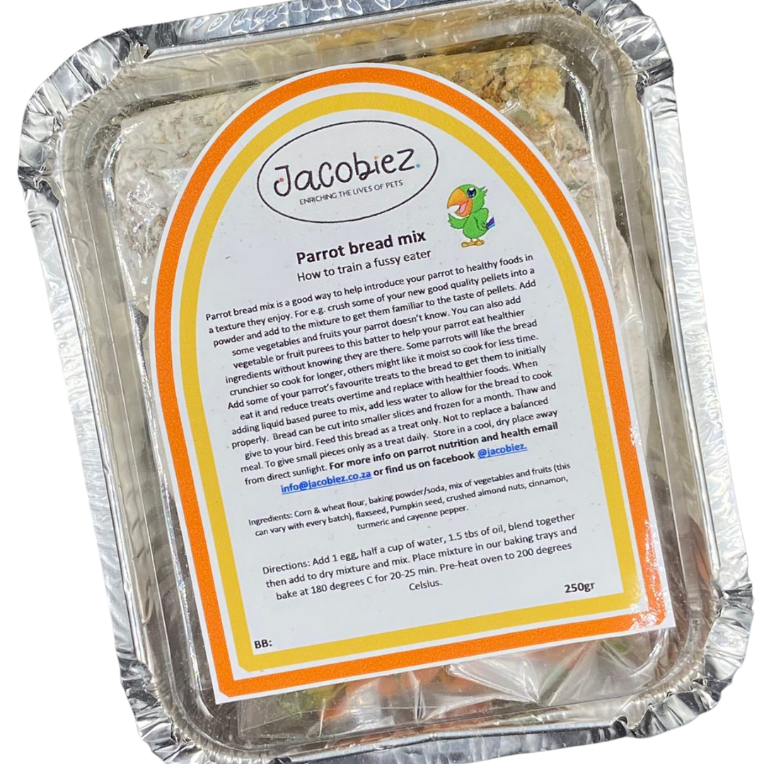 Feed small pieces as treats only. This bread mix should not replace a well-balanced meal and should be fed as a treat only. Parrot bread is a great way to try to introduce new flavours in a texture your parrots enjoy. We recommend adding vegetables or fruit smoothies to the baking mix to get them to taste new flavours and encourage your birds to eat vegetables. You can also add powdered parrot pellets to the mix to get them used to the taste of new pellets when trying to convert your parrot to pellets.