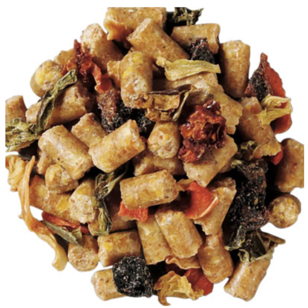 ~ An enticing, no-waste blend of peaches, apricots, plums, bell peppers, carrots, tomatoes, and cabbage combined with Roudybush Daily Maintenance pellets