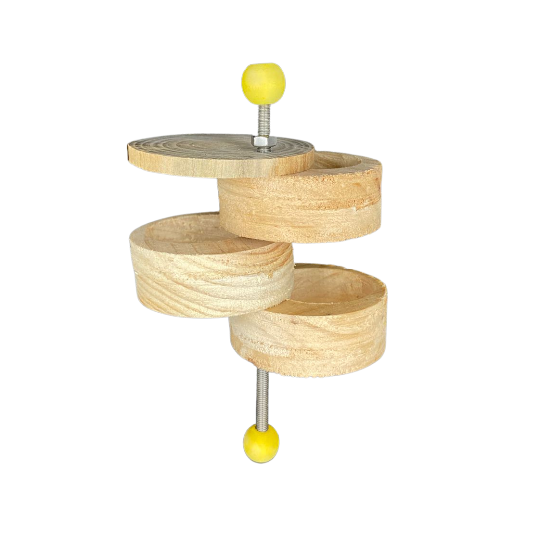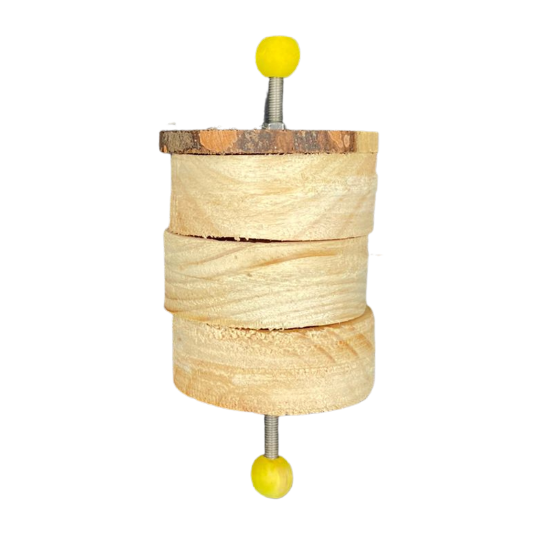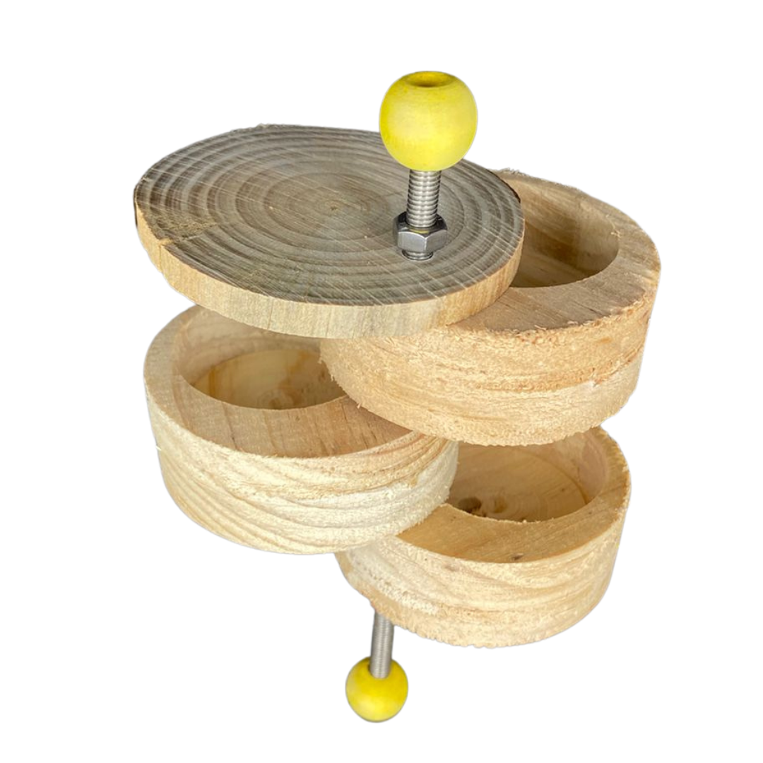 This toy attaches either to the top or bottom of a cage with screw, washer and wingnut. Hide your pets favourite treats into each compartment and place them back together into a tower. Watch your pet try to figure out how to move apart each compartment of so as to retrieve a treat. Difficulty level can be increased by screwing the top nut tighter.