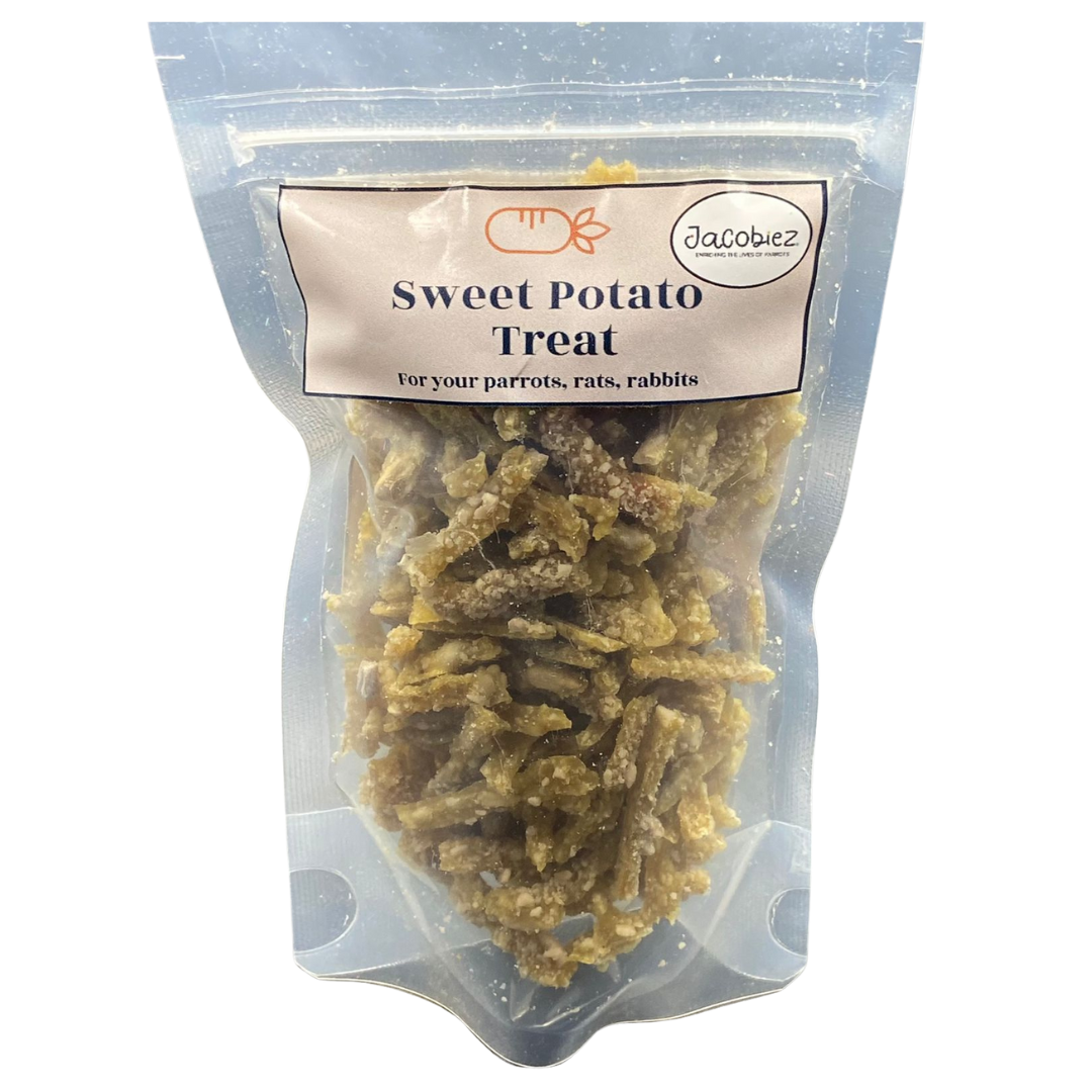 A delicious dehydrated sweet potato treat mixed with rolled oats, millet and flaxseed. This treat is good for parrots, rats and rabbits. Flaxseed contains omega 3 fatty acids that help maintain skin and fur or feather health.