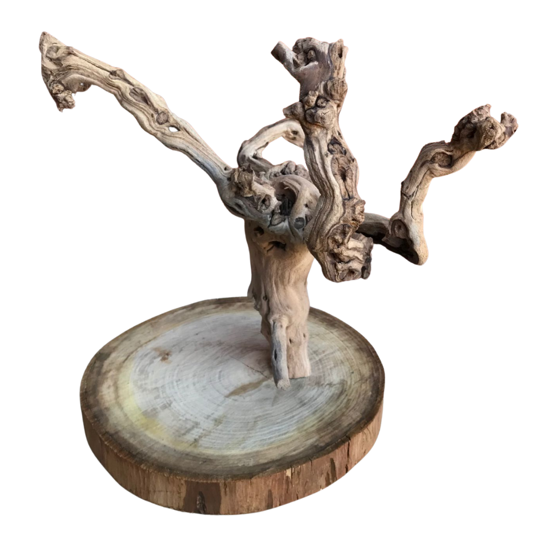 Octopus-style grapevine tabletop playstand on round eucalyptus wood base.